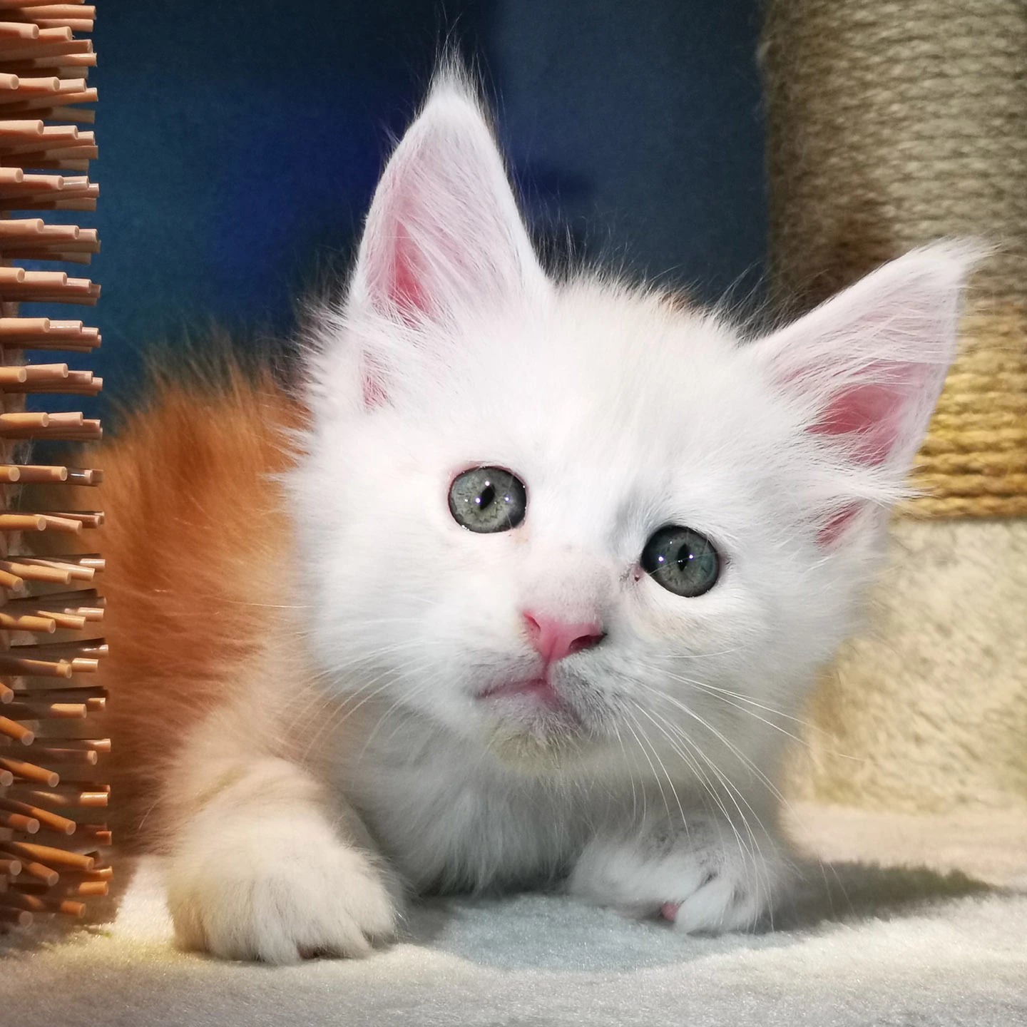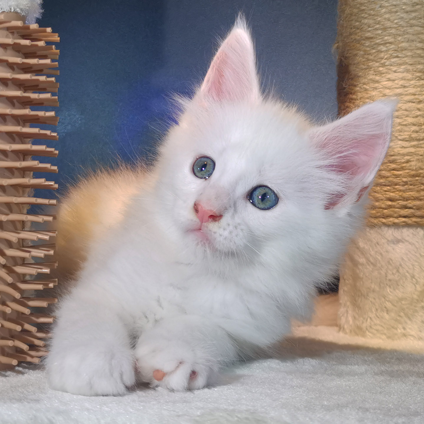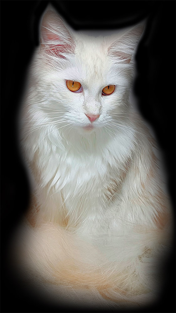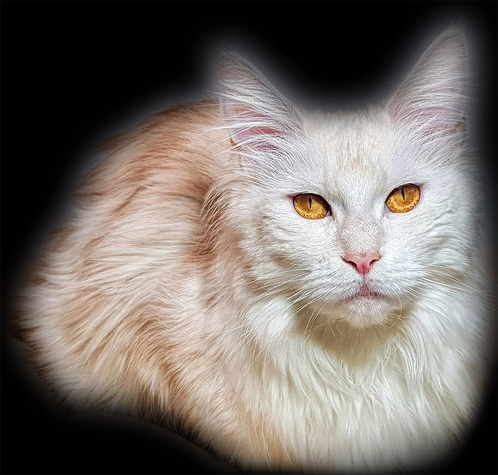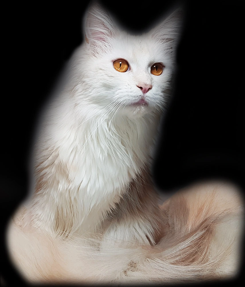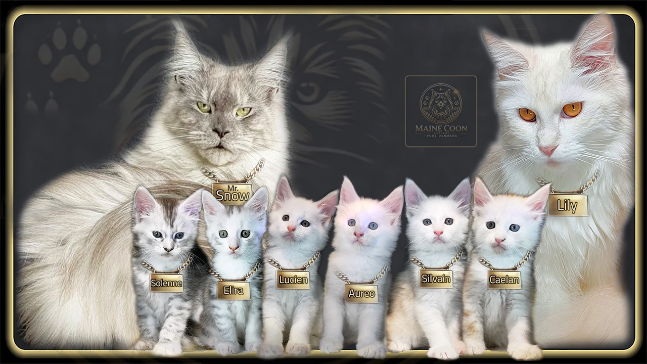 Lily van Pure DenMark is een schitterende Maine Coon met een zachte crèmekleurige vacht en opvallende koperkleurige ogen. Haar uitstraling is net zo bijzonder als haar karakter: kalm, zachtaardig en liefdevol.