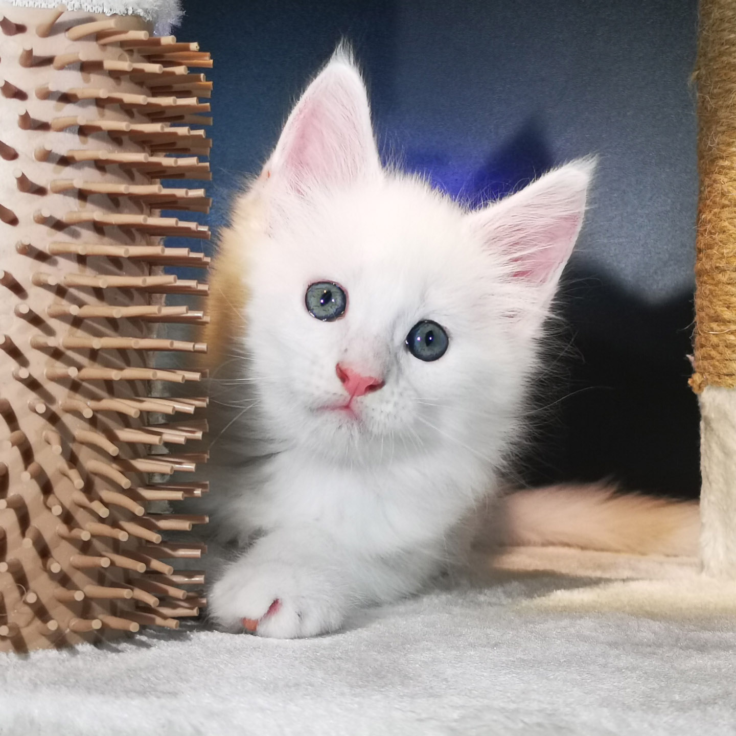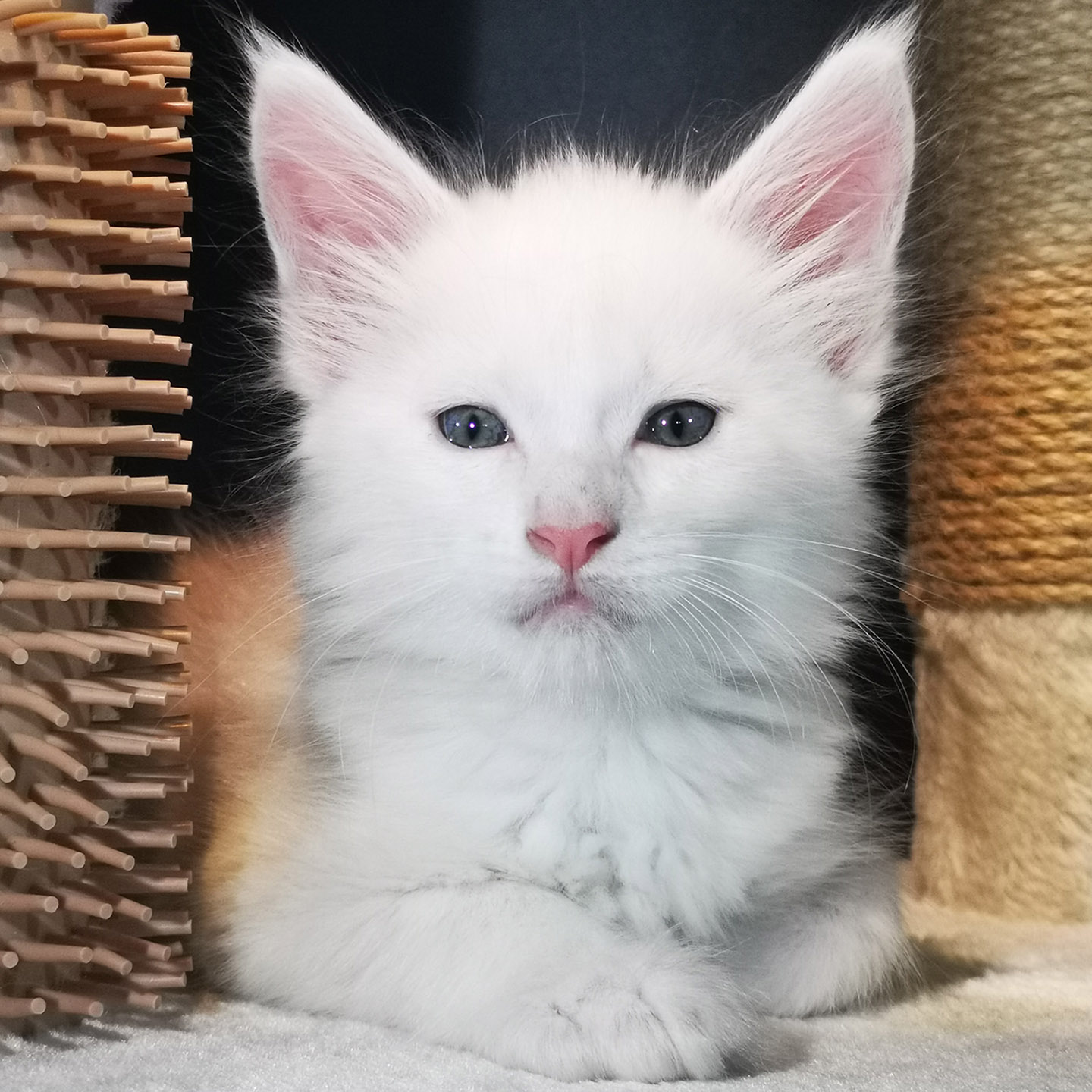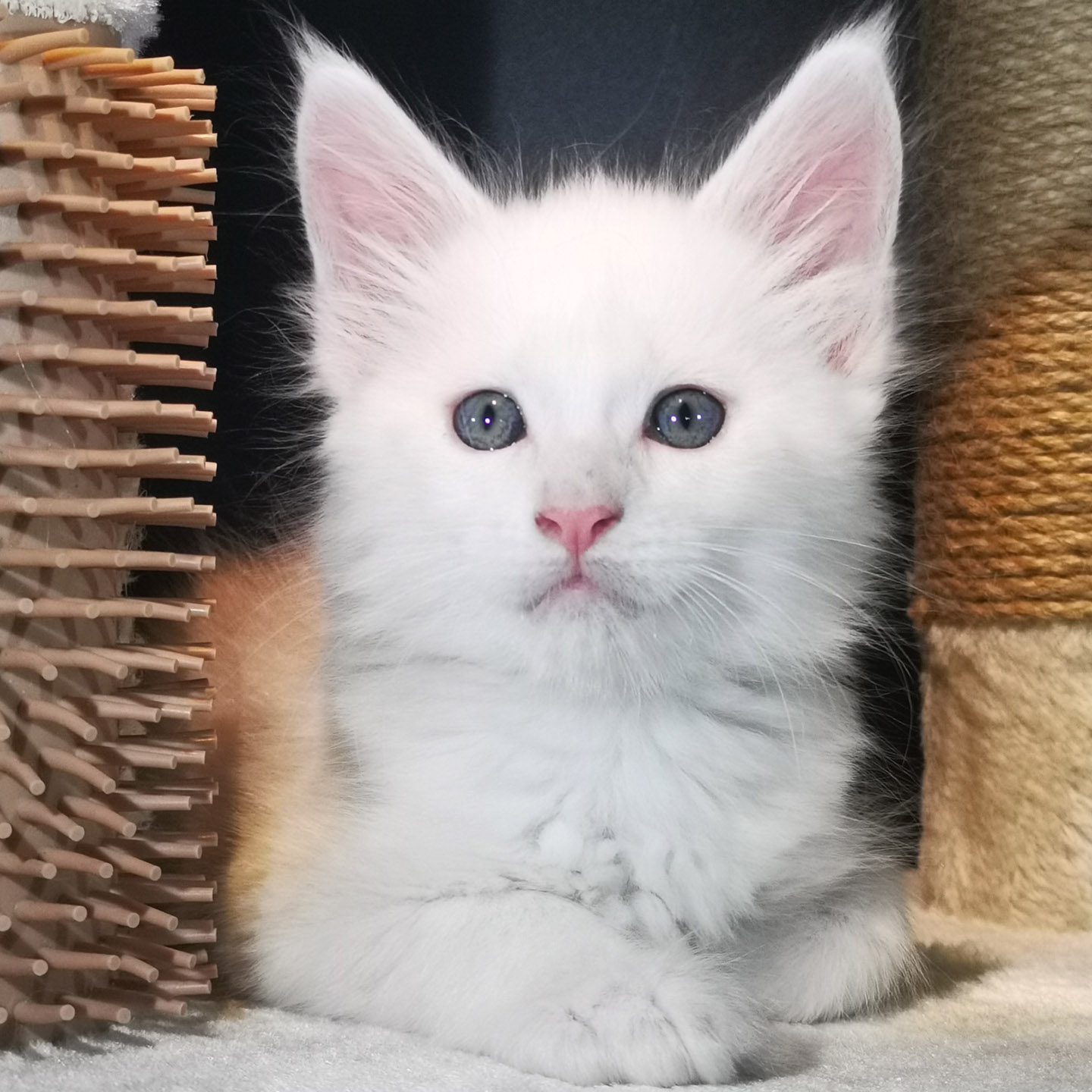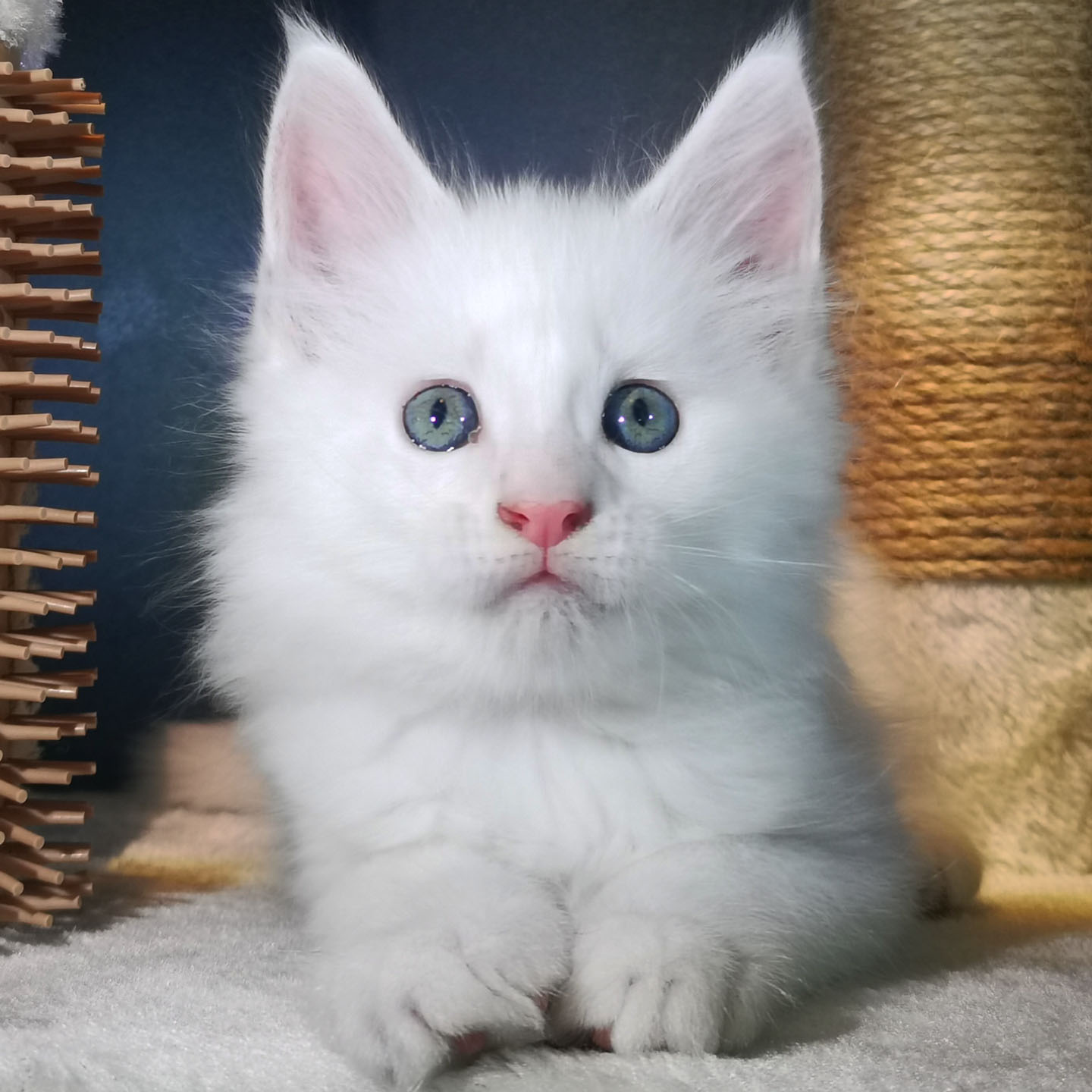 Lily van Pure DenMark is een schitterende Maine Coon met een zachte crèmekleurige vacht en opvallende koperkleurige ogen. Haar uitstraling is net zo bijzonder als haar karakter: kalm, zachtaardig en liefdevol.