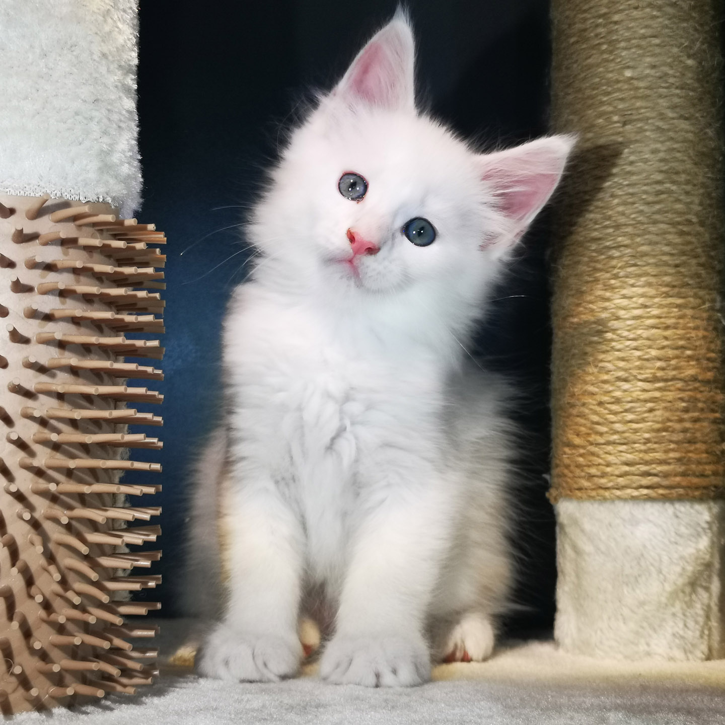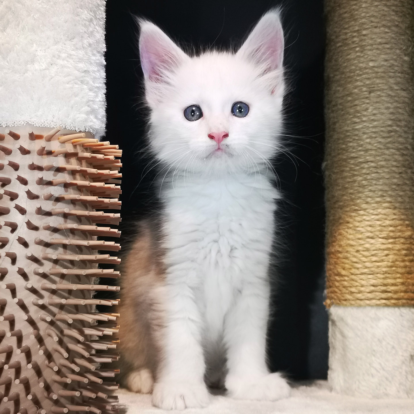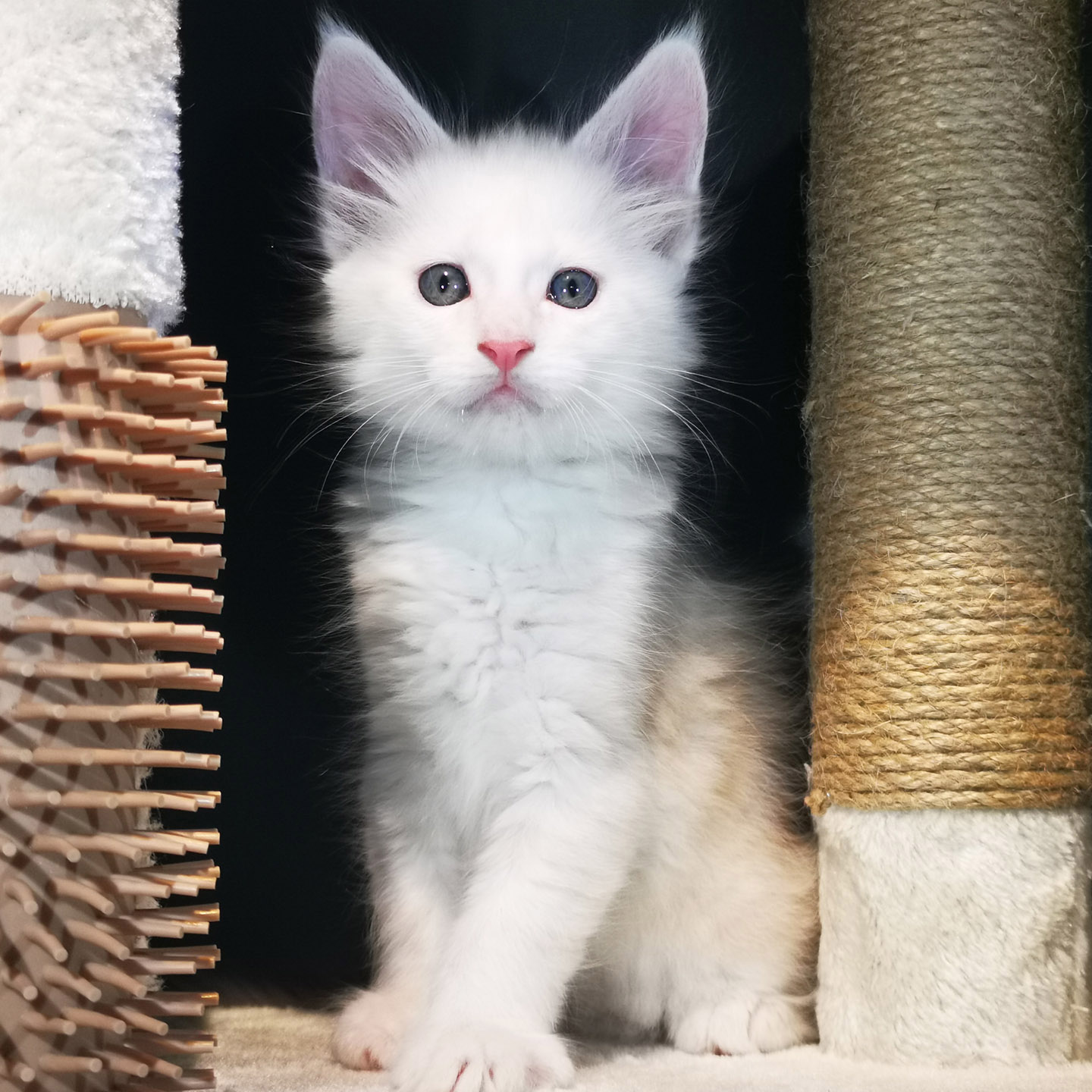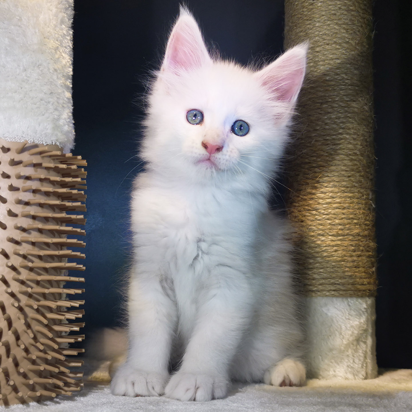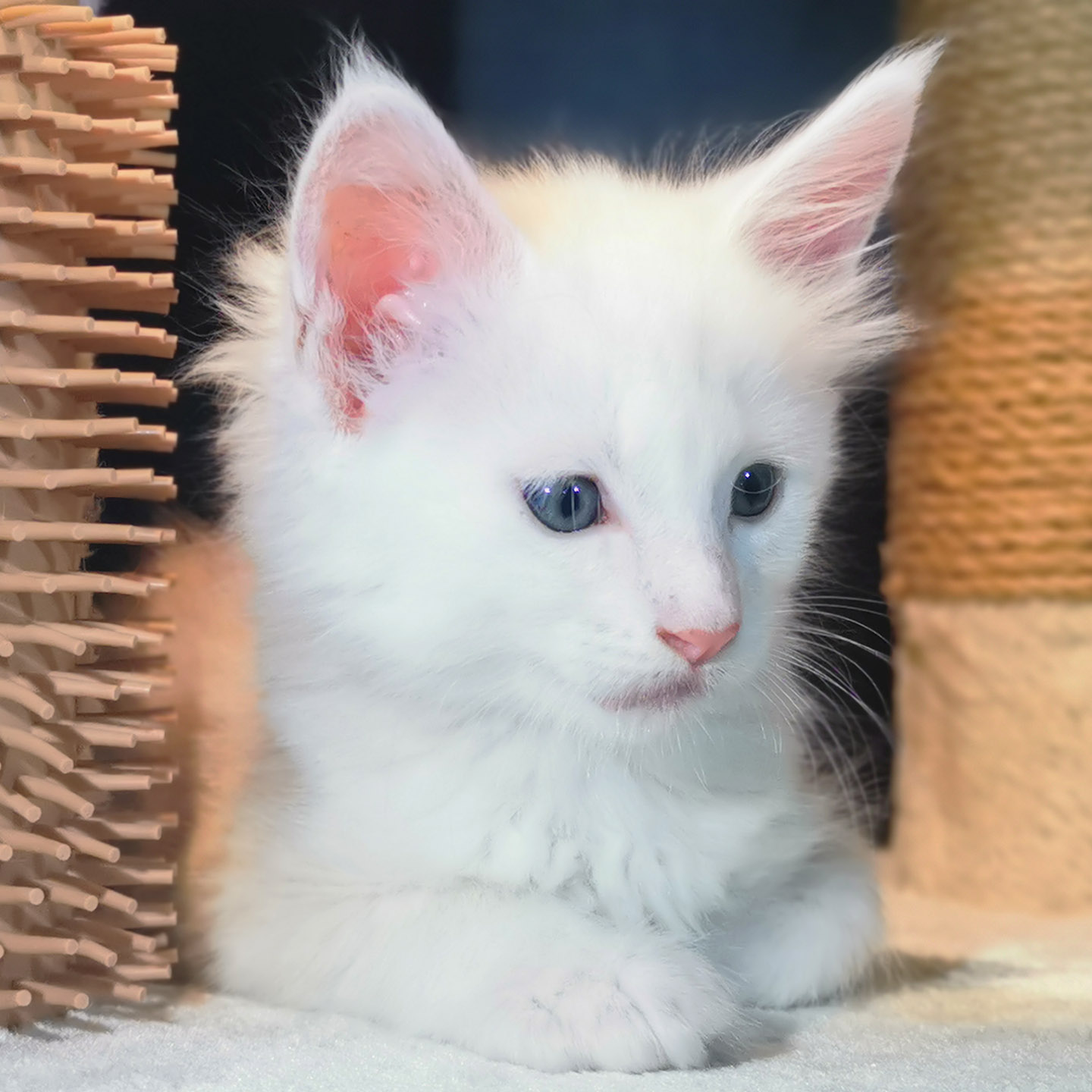 Lily van Pure DenMark is een schitterende Maine Coon met een zachte crèmekleurige vacht en opvallende koperkleurige ogen. Haar uitstraling is net zo bijzonder als haar karakter: kalm, zachtaardig en liefdevol.
