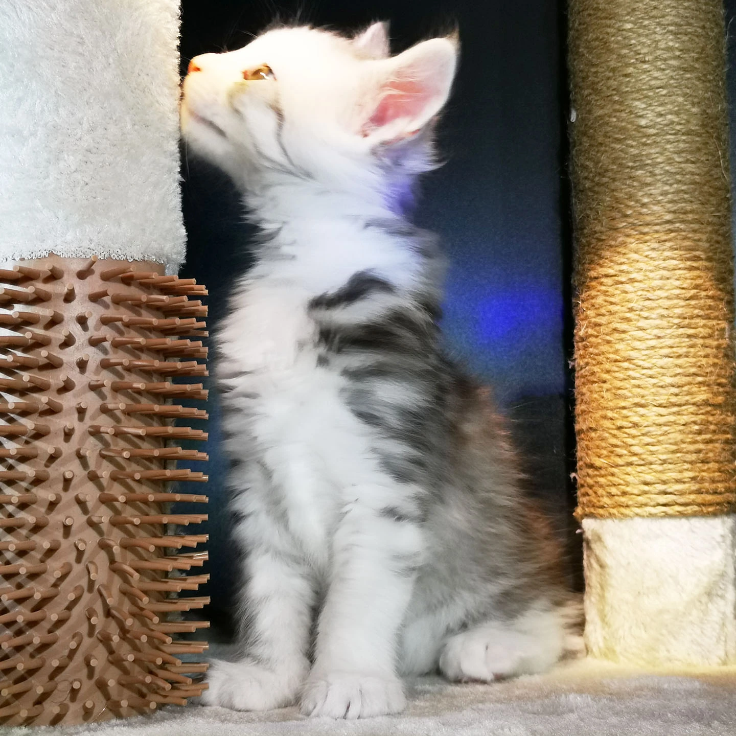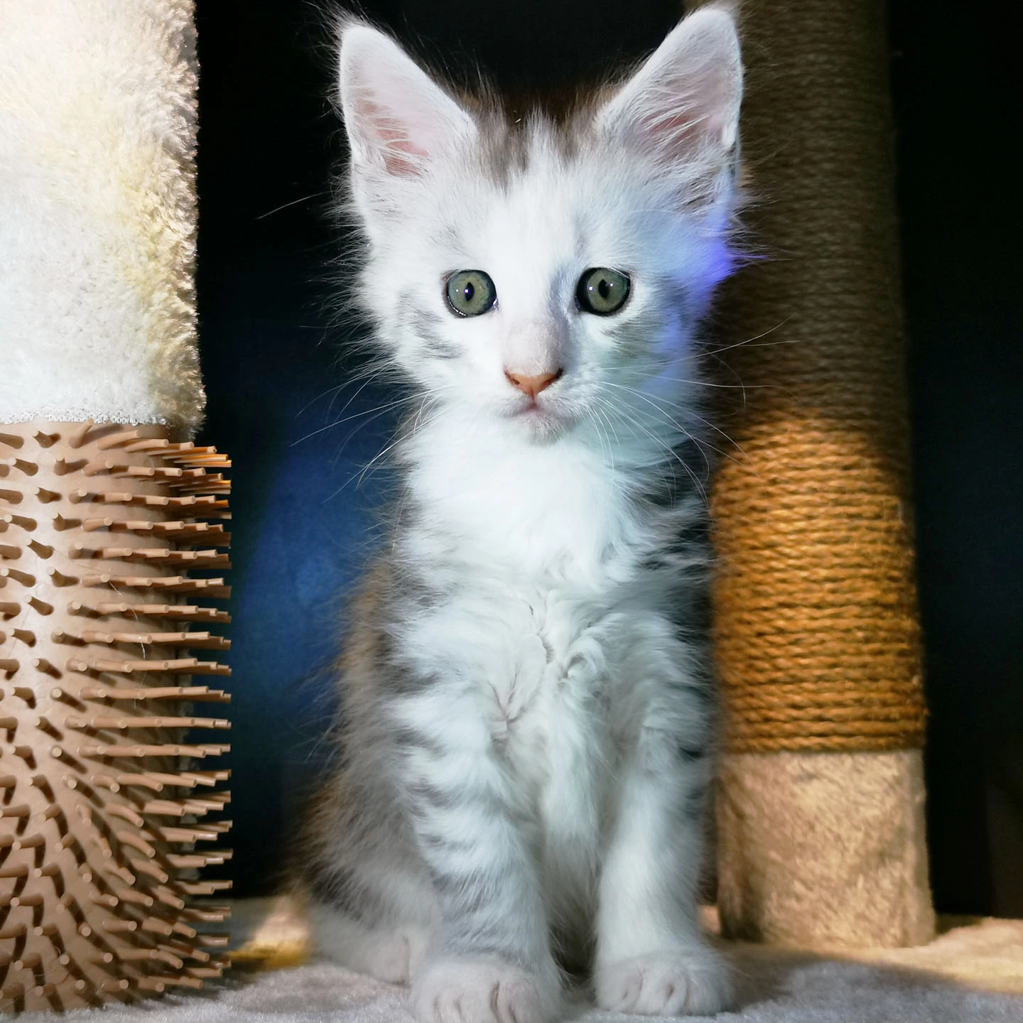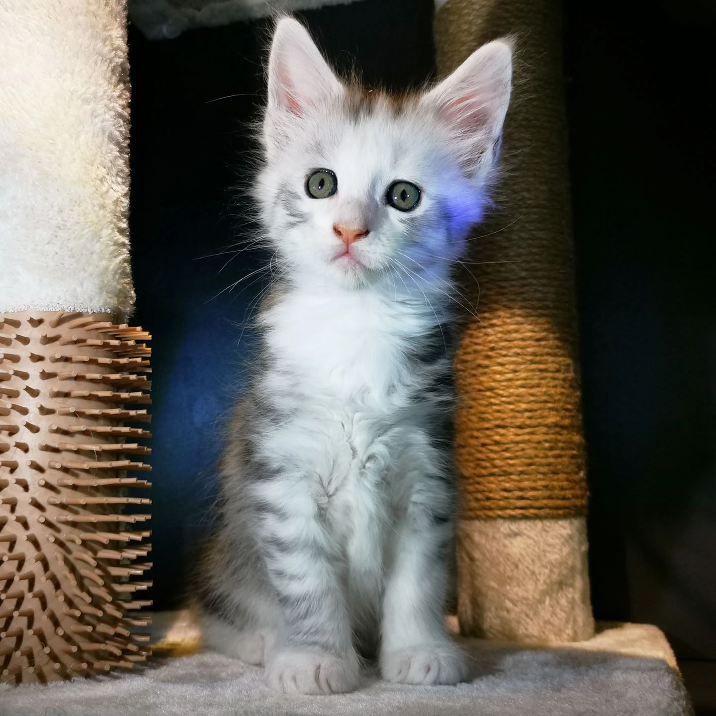 Mr. Snow is een indrukwekkende verschijning met zijn elegante black silver tabby blotched vacht en heldere, expressieve blik. Achter zijn koninklijke uitstraling schuilt een zachte ziel met een heerlijk aanhankelijk karakter.